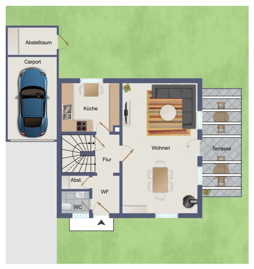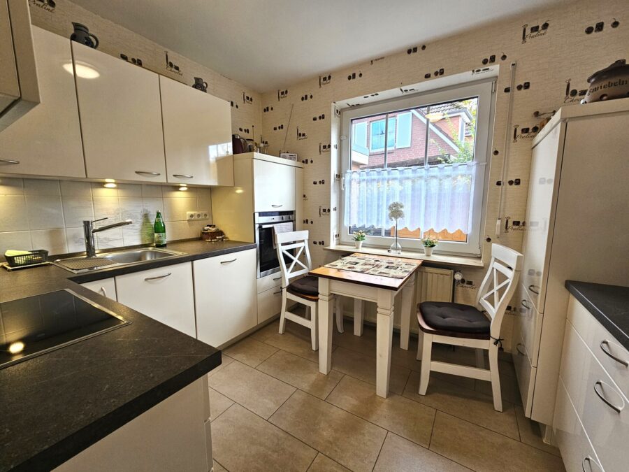 Auf rund 81 m² Wohnfläche entfaltet sich ein durchdachtes Raumkonzept, das jeden Quadratmeter sinnvoll nutzt. Schon beim Betreten spürt man, dass hier mit Liebe gewohnt wurde: Im Erdgeschoss erwartet Sie ein einladender Flur mit Gäste-WC und praktischem Abstellraum. Herzstück des Hauses ist das helle Wohn- und Esszimmer mit seinem behaglichen Kamin, der an kühleren Tagen für eine warme, wohnliche Atmosphäre sorgt. Von hier öffnet sich der Zugang zur Süd-Terrasse – mit hochwertiger Glasüberdachung und elektrischer Verschattung. Ein Ort, an dem Sie den Feierabend genießen, Freunde empfangen oder einfach die Sonne über dem eigenen Garten untergehen sehen können.