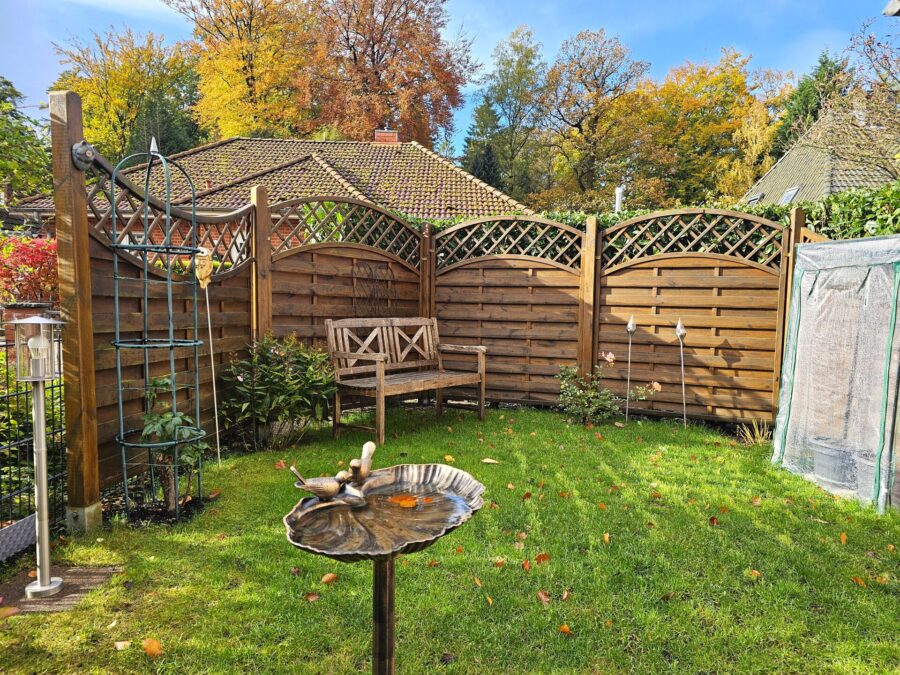 Das rund 219 m² große Grundstück ist komplett eingefriedet und eingewachsen – pflegeleicht, aber charmant begrünt. Ein Carport mit massivem Geräteschuppen (ca. 4,7 m²) sowie ein weiterer Stellplatz davor bieten Platz für Auto, Fahrräder oder Gartengeräte.